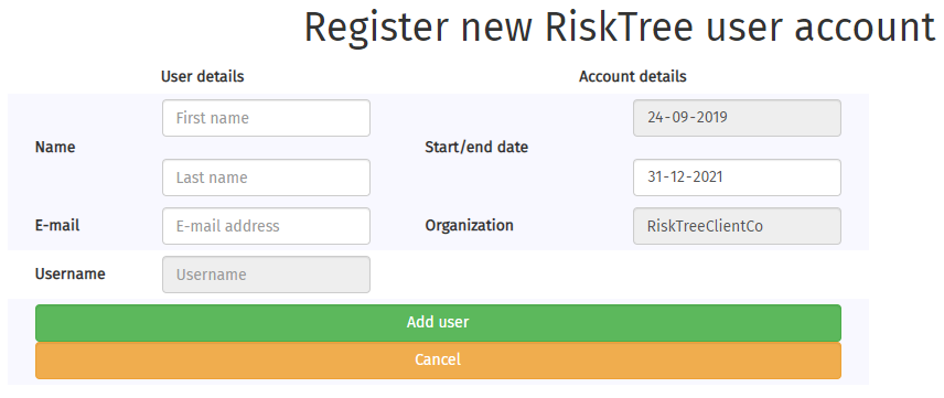 A new RiskTree Viewer account is created by clicking on the button on the Subscription usage tab. This will open a form that you will need to complete.