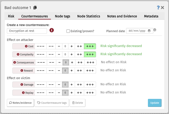 A countermeasure library is a set of countermeasures that can be reused across multiple RiskTrees to standardize countermeasure names and values. You can create a library by either saving the countermeasures from an existing tree (see below), or by using the Countermeasure Manager tool.
