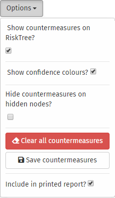 If you have built a RiskTree and wish to use the countermeasures in it as the basis of a countermeasure library, go to the Countermeasures. Click on the Options button, and