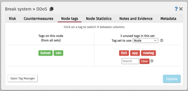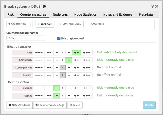 To open the node editor, hover over the node you wish to modify and click on the edit node button or double click the node. Within the editor, you'll have full control over various aspects of the node: risk assessment values, notes, evidence, tags, countermeasures, statistics and metadata.