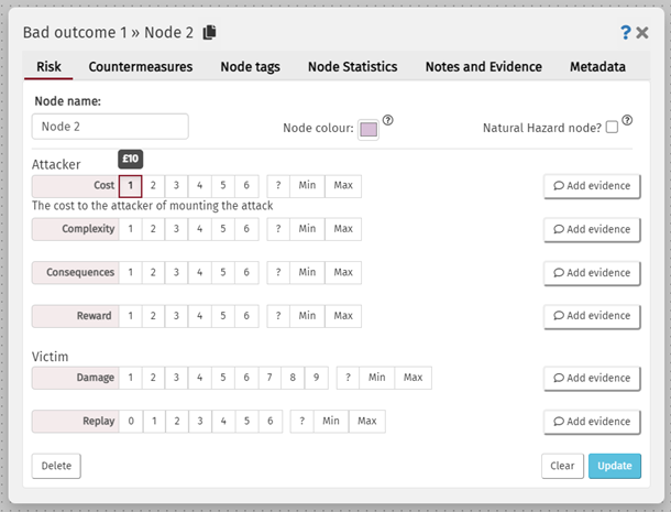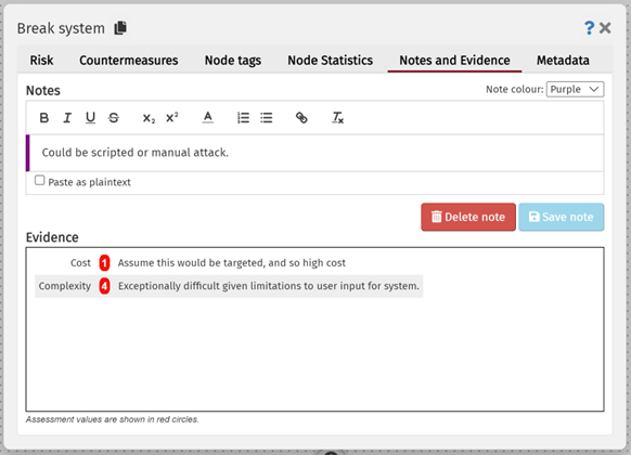 In the notes and evidence tab you can add or remove notes from the node. You can also see a list of all the evidence you have entered for your risk assesment values. These can not be edited in the Node and Evidence tab, but can be edited in the Risk tab.