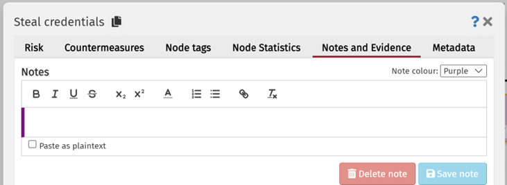 Notes are used on nodes to capture more information than the node name can convey. To add a note to a node, hover over the node you would like to edit the tags of and click the edit node button. When in the node editor, click on the 'Notes and Evidence' tab.