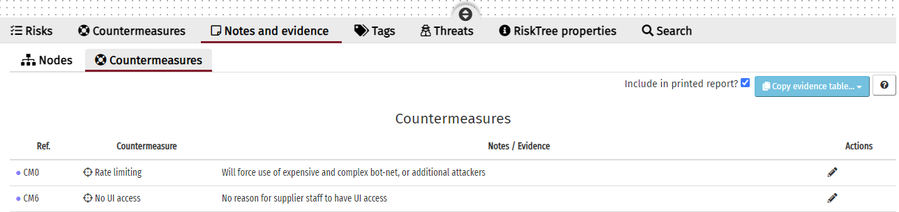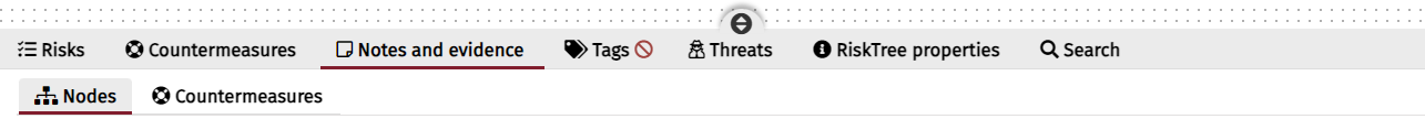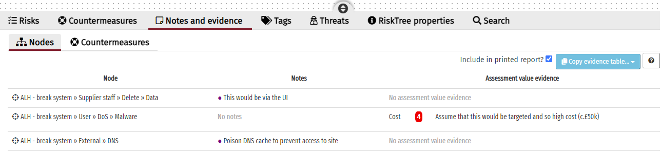 The third tab beneath the RiskTree shows all of the notes and assessment value evidence that have been provided for the current RiskTree. Under the main tab are two sub-tabs, for Nodes and for Countermeasures.