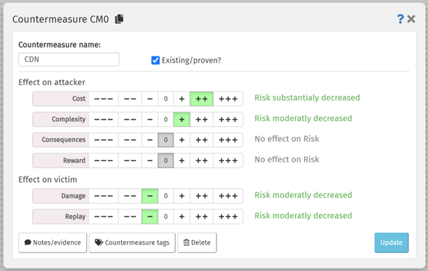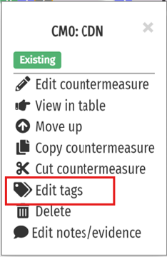 To add a tag to a countermeasure, click the circle countermeasure icon and click Edit tags, or click the 'Countermeasure tags' button from the countermeasures tab of the node editor.