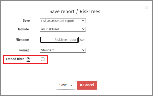 If a filter is set when you save the risk report, you can decide whether to include the filter in the saved file. An additional option will appear in the Save Report dialogue box; if this is ticked then the filter will be included.
