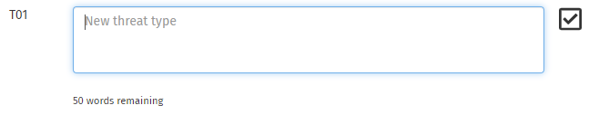 You can add your own threats by clicking on the button. This will add a new row at the bottom of the table. New threats all have an ID consisting of T followed by a number. The checkbox will be automatically ticked, and you will need to enter a name for the threat. The name can be descriptive, and you can use up to 50 words.