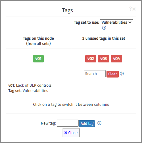 In order to perform a Vsort threat assessment, you need to tag each of your risks with the vulnerability (or vulnerabilities) that facilitate it. In Designer, load the vulnerability tag file using the Import file tool. Select the file and import it; the number of vulnerabilities in the file will be confirmed. Next, tag each risk (end node) with the relevant vulnerability tags.
