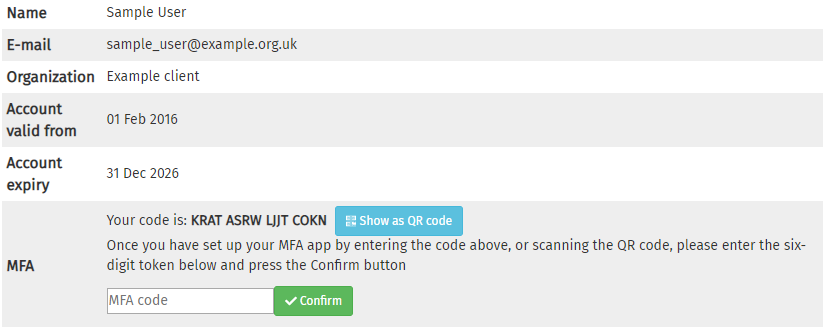 You can enter this code into your MFA application, or, if supported, you can use a QR code. To do this, click the button. The QR code will appear to the right.