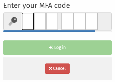 If MFA has been enabled for your account, you will need to enter the MFA code generated by your MFA app when logging in. This is entered after you have provided your username and password (if you haven't enabled MFA, you won't be taken to this box):